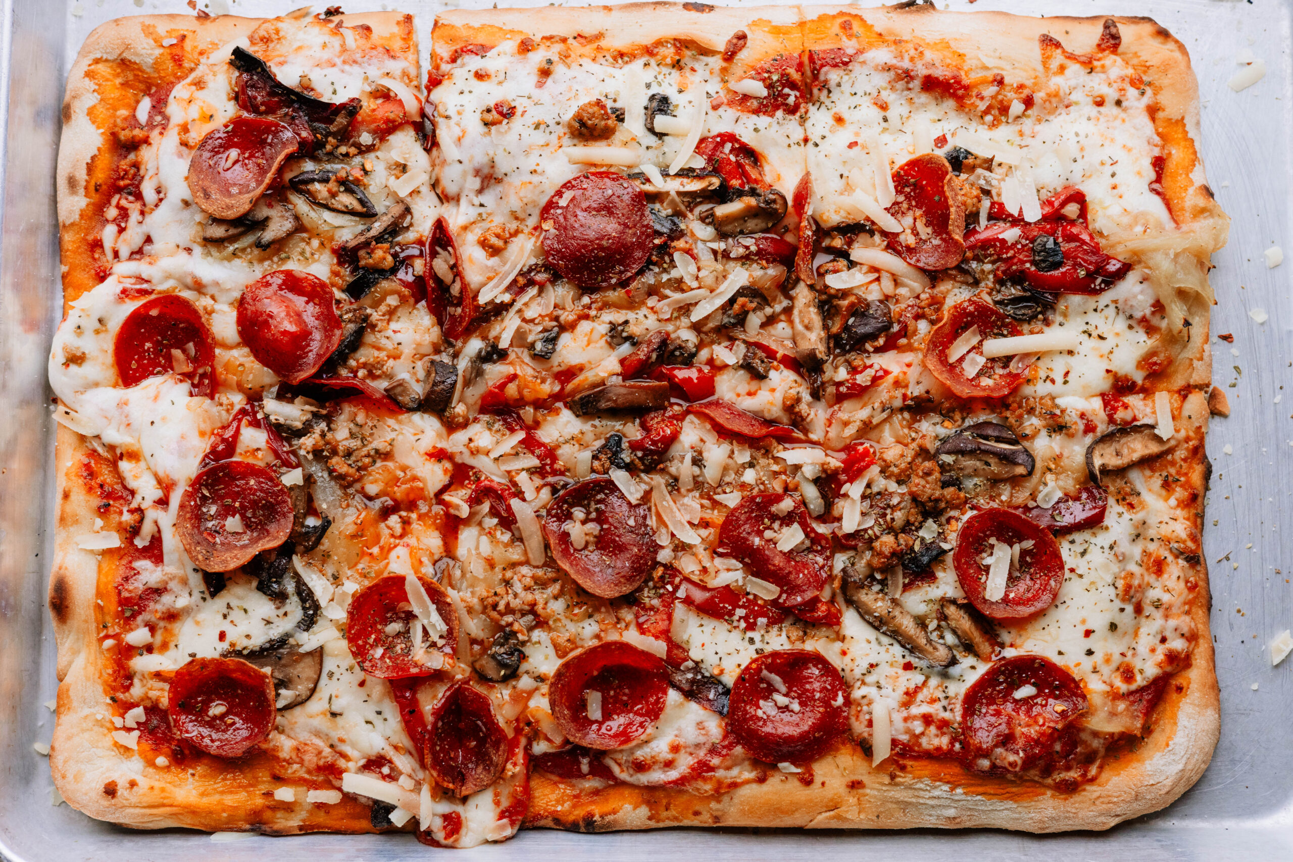 Tomato Sauce, Green Olives, Mushrooms, Onions, Peppers, Sausage, Pepperoni, Mozzarella